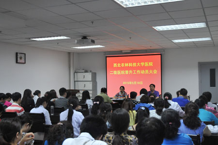 赵军虎在会上宣读了《关于成立医院等级晋升领导小组及办公室的通知》。穆沛红院长对《西北农林科技大学医院二级医院综合晋升实施方案》进行了详细解读和分析,对晋升二级医院的目的和重要意义进行了说明,对二级医院评审工作的组织机构、工作职责、阶段性目标任务等进行了安排和部署,要求大家统一思想,提高认识,振奋精神,凝聚力量,以二级医院晋升工作为契机,全面提高医疗护理质量,提高医疗安全认识,提高医院管理水平和能力。穆沛红强调,人人都是二级医院晋升工作的参与者,个个都有具体分工,我们要举全院之力,为实现二级医院晋升目标,促进医院长远发展做出贡献。
