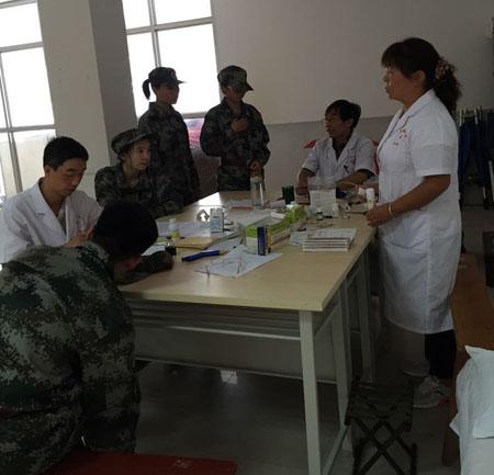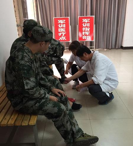 由于天气炎热,军训强度较大,学生中各种伤病较多,每天上百人就诊。为了保障军训期间学生及教官的身体健康,卫生队医护人员坚守岗位,用心服务,认真处治各种伤病学生,防止学生军训过程中各类意外事故发生,确保新生军训工作顺利进行。