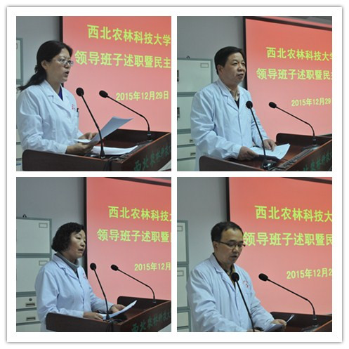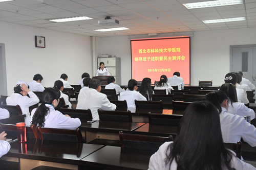 赵军虎书记传达了学校《关于做好2015年度处级单位综合考评工作的通知》精神。穆沛红院长代表领导班子从党建工作开展情况、二级医院晋升工作、人才队伍建设、规范聘用工管理、制度建设、改善医院医疗条件、加强医院质量管理和提高服务水平及2015年医院各项工作目标完成情况等进行了述职,对2016年医院工作设想进行了说明。穆院长强调,2015年在全院职工的共同努力下,医院圆满完成了各项工作目标任务,取得了一定的成绩,但与学校的要求和职工的期盼还存在差距,今后我们要认真贯彻落实党的十八大精神,以提高医疗质量、保证医疗安全、规范医疗行为、增强运行绩效为导向,以新眼光、新起点为基础,全面实施二级医院评审工作,为全校师生的健康做好医疗服务,为学校的教学科研工作做好有力保障。