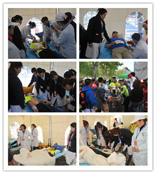 明确人员责任分工。在第4医疗站安排了13名医护人员和16名学生志愿者。医护人员分内科、外科专业,各率3个小组(一医一护组成)。学生志愿者负责从半程终点轮椅运送、搀扶需要救治的运动员。其他23名医务人员及14名学生志愿者分布在沿途各医疗点。