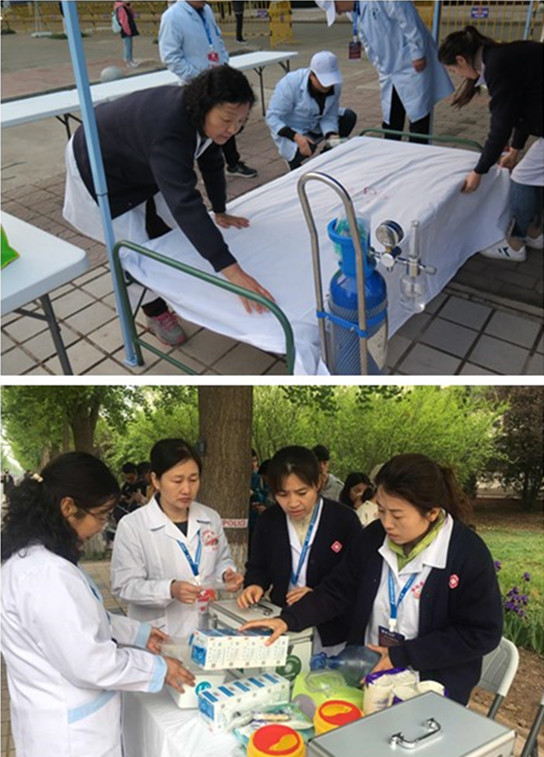 为了做好2019年“杨马”医疗保障任务顺利进行,医院领导班子高度重视。首先,成立医疗保障急救工作组,院长穆沛红任组长,书记颜玉怀任副组长,制定了详细的保障方案,并挑选精兵良将,组建了一支70人的专业医疗救护队伍,其中医护人员35人,学生志愿者35人。其次,还对参与医疗保障的队员进行急救技能强化培训,包括心肺复苏、人工气囊操作、简易除颤仪AED的使用及各种院前急救培训与演练,并确保其考核通过。