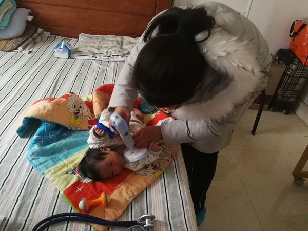 11月29日上午,校医院副院长、副主任医师屈宁宁、妇科医生吕小可和主管护师石娟妮通过入户的形式,给新生儿和产妇做访视体检工作。